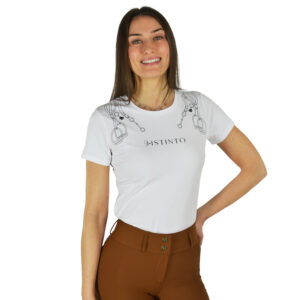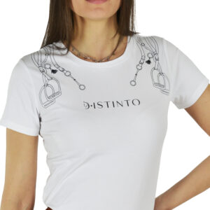 T-shirt donna a manica corta in fibra naturale, offre comfort e leggerezza durante tutta la giornata. Con stampa con dettagli ispirati al mondo equestre e logo D·ISTINTO sul davanti. Femminile, versatile e facile da abbinare, è perfetta per un look casual dal carattere distintivo.
