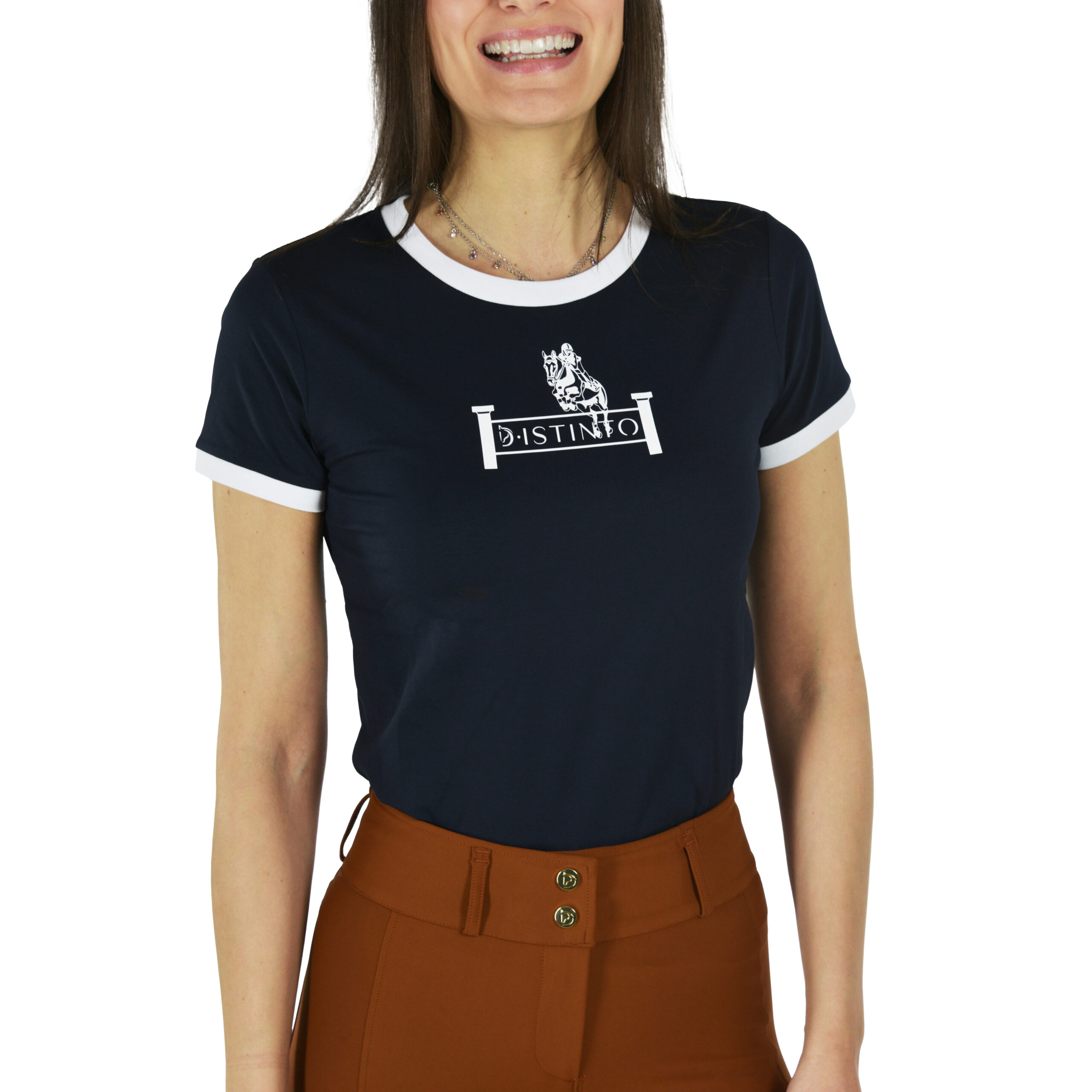 T-shirt donna a manica corta dal fit aderente, perfetta per un look sportivo e curato. Il design essenziale è valorizzato dal colore blu navy, dai profili a contrasto bianchi e dal logo D·ISTINTO sul davanti. Un capo versatile, facile da abbinare, ideale per il tempo libero e per uno stile equestre contemporaneo. In fibra naturale.